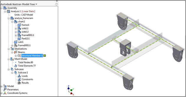 下图显示了一个具有使用结构件生成器创建的杆件的 Inventor 模型示例。杆件由梁单元表示,如模型树中所示: