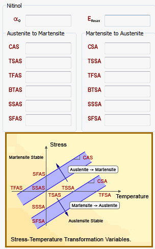 “镍钛诺合金”材料仅用于非线性分析。从“类型”下拉列表中选择“镍钛诺合金”后,以下材料部分可用:“常规”、“结构”和“镍钛诺合金”。