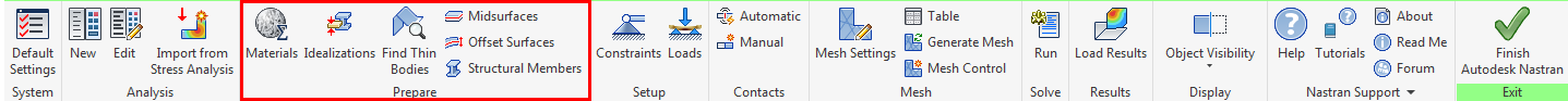 “准备”命令用于定义材料、创建理想化、基于 Inventor 实体对象创建壳体单元部件,也用于管理使用 Inventor Frame Generator 创建的结构杆件: