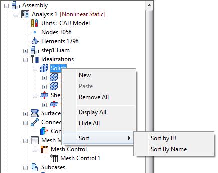 单个“理想化”节点包含在“零件/部件”浏览器节点中。在此节点中,您将看到这五种类型的理想化(“实体”、“壳”、“梁”、“集中质量”和“连接器”),其中每一个都有一个子节点包含在分析中。“表面接触”会在单独的浏览器节点中(不在“理想化”中)列出。使用关联菜单,您可以直接在“零件/部件”分支中创建新的理想化,而不必先转到“模型”分支。您还可以删除某个组中的一个或全部理想化,显示或隐藏理想化,或者对它们进行排序: