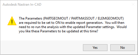 单击“是”,然后重新运行分析以生成报告。如果单击“否”,则在不使用“PARTGEOMOUT”、“PARTMASSOUT”和“ELEMGEOMOUT”设置的情况下继续生成报告。