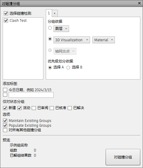 预览 - 查看将为碰撞组指定的名称以及将创建的组数。您还可以查看不会根据您的条件进行分组的碰撞数。如果选择“对所有其他碰撞分组”选项,则这些碰撞将放入名为“其他”的组中。
