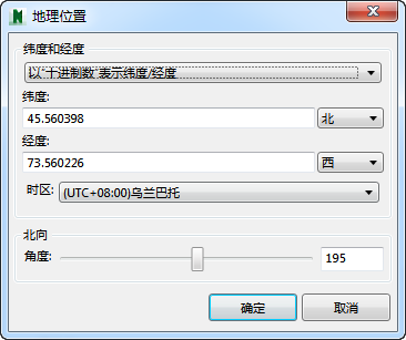 使用此对话框可在模型中设置地理位置的纬度、经度和北向。“场景视图”会显示太阳在自定义时区的自定义位置。