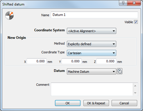 - 若要在指定位置创建基准,请执行以下操作:选择要沿其轴平移基准的坐标系;在“方法”列表中选择“显式定义”;然后输入平移基准相对于选定坐标系的坐标。例如: