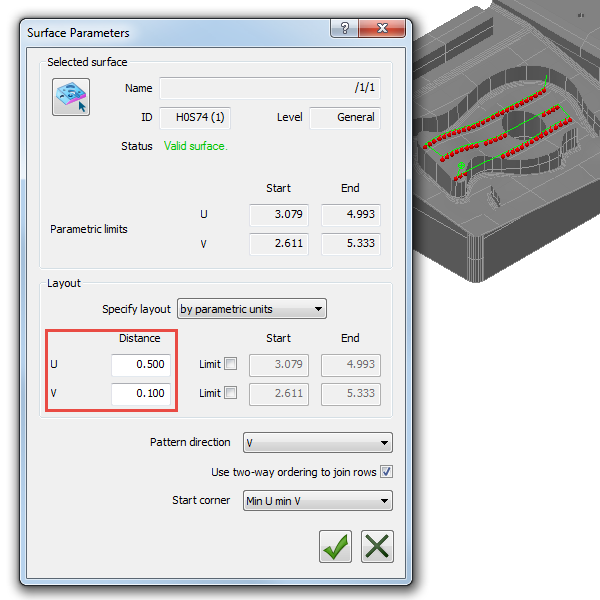 在本示例中,“U”框指定行之间的步距距离,“V”框指定点之间的节距距离。这两个值均使用为曲面指定的参数化单位表示。