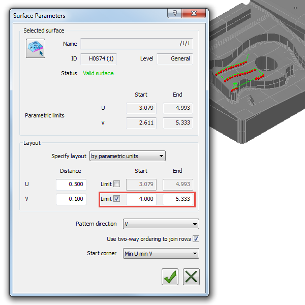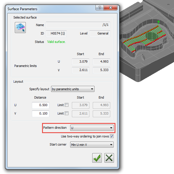 通过“曲面参数”对话框中的“按参数单位”选项,您可以使用模型的曲面参数化来控制曲面上探测点的密度和位置。控制检测路径的步距和节距距离的框取决于选定曲面的 U 和 V 方向。