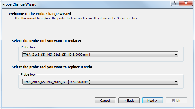 - 如果编辑文档以用于 CNC 测量设备,“测头改变向导”会要求您选择要进行的更改类型。选择“改变探针工具”,然后单击“下一”指定要替换的工具。