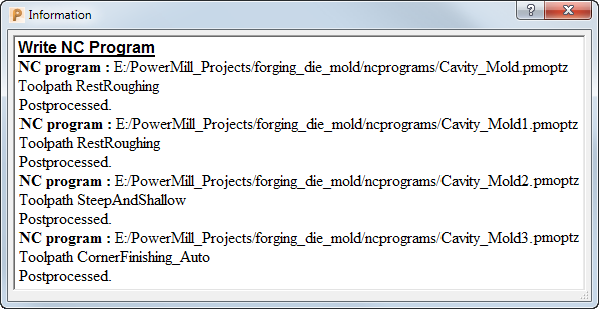 - PowerMill 使用指定的参数来后处理刀具路径,并显示确认窗口,以指示文件的保存位置。