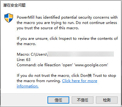 PowerMill 会在您从 PowerMill 内运行宏时检查是否存在任何潜在的安全问题。如果宏中存在任何安全问题(例如可能有害的命令),PowerMill 会提示您检查这些命令,以查看它们是否可以安全运行: