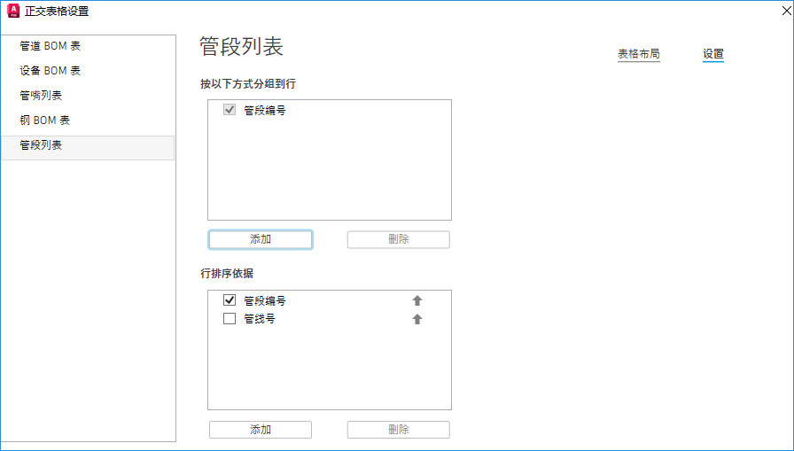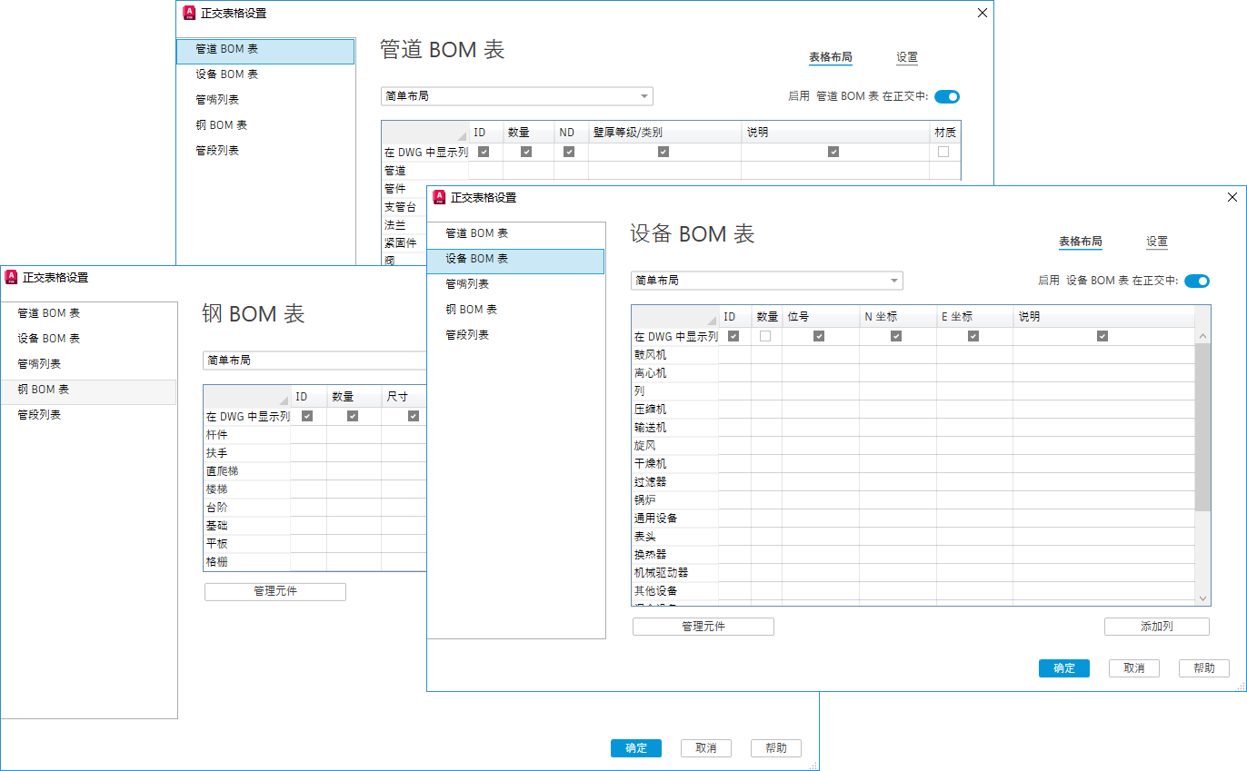 “正交表设置”对话框包含适用于正交图形的简化选项和更多表功能。现在,您可以将管道、设备、钢的 BOM 表以及管嘴和管段列表添加到正交图形中。