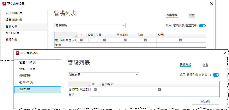 可以将管嘴和管段列表放置到正交图形中,并选择要在列表中显示的特性。