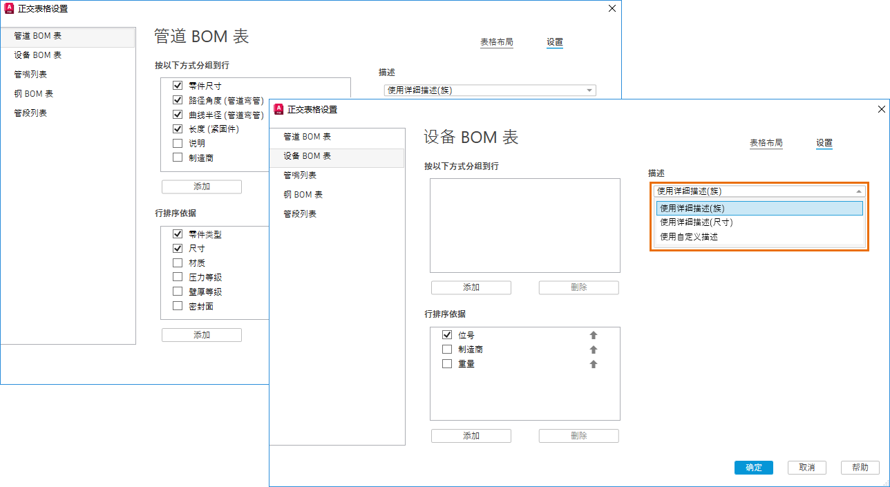 您还可以选择在 BOM 表中显示详细描述(族)、详细描述(尺寸)或自定义描述。