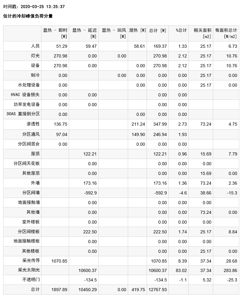 例如,“分区构件负荷汇总”包含每个分析空间的加热和冷却大小调整信息。空间峰值冷负荷的示例如下所示。在此示例中,总负荷为 12768W。