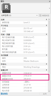 除了在分析之后生成的报告之外,还会将加热、冷却和气流峰值需求设置为每个分析空间上的属性。以下示例显示了与上述报告部分中亮显的冷负荷相同的冷负荷。