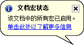 启用文档宏前询问 | 用户定义。 | 一个警告对话框将提示您启用或禁用宏。产生的答案将显示正确的图标。这是默认设置。 |