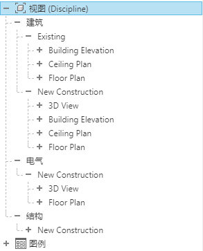下图显示项目浏览器中的视图是按规程、阶段和视图类型为排序顺序组织的。