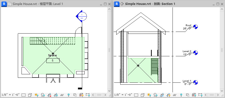 - 关闭除要放置空间的剖面视图和楼板平面外的所有视图,然后在键盘上键入 w t 以平铺这两个视图。
