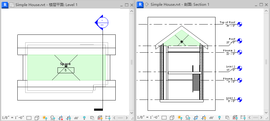 - 关闭除要放置空间的剖面视图和楼板平面外的所有视图,然后在键盘上键入 w t 以平铺这两个视图。