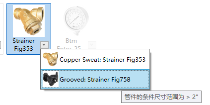 如果单击箭头,下拉列表将显示基于尺寸的其他构件。 此下拉列表由服务定义中的条件控制,类似于布管系统配置。 例如,弯头可使用达到特定尺寸的压制弯头和超过此尺寸的分段弯头。将光标放置在列表中的构件上时,工具提示将显示基于此构件条件的尺寸范围。