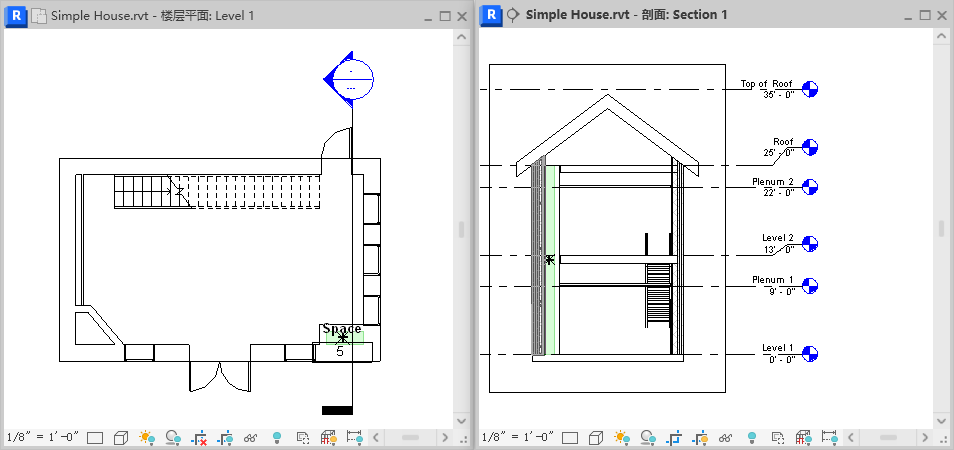 - 关闭除要放置空间的剖面视图和楼板平面外的所有视图,然后在键盘上键入 w t 以平铺这两个视图。