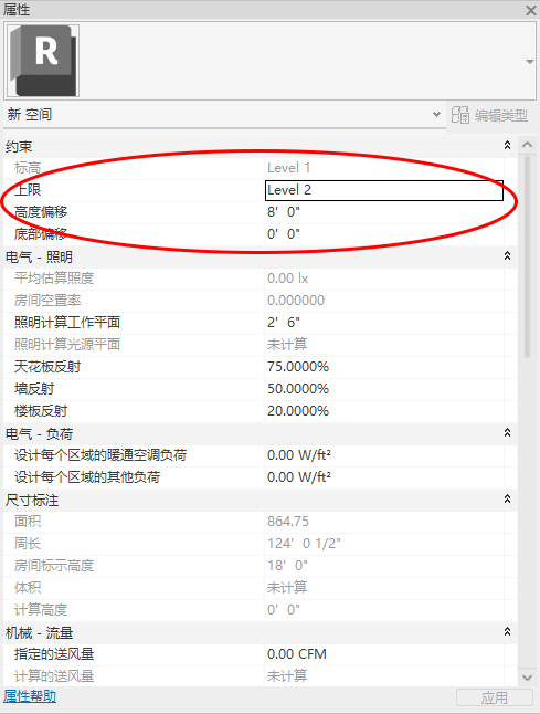 如果垂直长度超过房间边界图元(例如楼板或天花板),空间将捕捉到房间边界图元。 但是,拖曳控制柄和关联尺寸将指明指定的垂直长度,如下图所示。