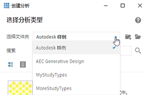要使用 Autodesk 示例之一创建分析,请在“创建分析”对话框中,为“选择文件夹”选择“Autodesk 样例”。