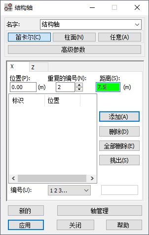 在“X”选项卡上,将“位置”设置为“0.00”、将“重复的编号”设置为“2”,并将“距离”设置为“7.5”,如下图所示。