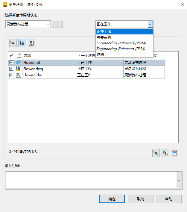- 单击“确定”。新状态将应用于选定的对象。文件版本按照 1 递增。