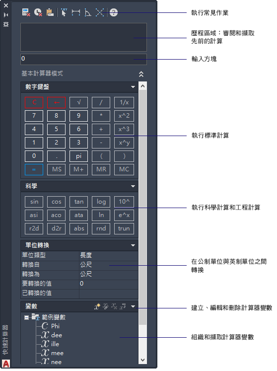 「快速計算器」除了科學計算器的基本功能之外,還包含幾何函數、單位換算和變數的功能。