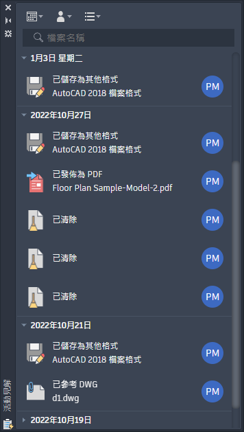 圖面的每項變更並非都會記錄為特定事件。例如,在儲存圖面後,一般圖面編輯 (例如繪製線條或圓) 會記錄為「已編輯」事件,而列印和發佈會記錄為「已發佈」事件。