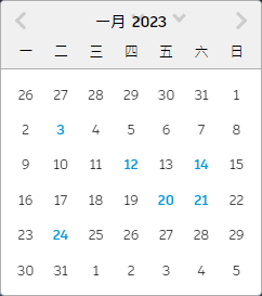 - 自訂 - 顯示用於選取兩個或多個日期的日曆。指定的日期會以藍色亮顯。