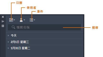 顯示「活動見解」選項板,以檢視目前圖面的事件。您可以使用日曆、使用者、事件或搜尋等篩選,來篩選事件。