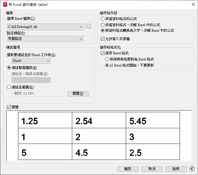 可將 Excel 檔內整個指定的工作表連結至圖面中的表格。