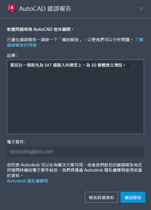 以下是輸入一些選擇性資訊的「AutoCAD 錯誤報告」對話方塊: