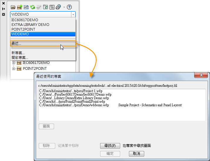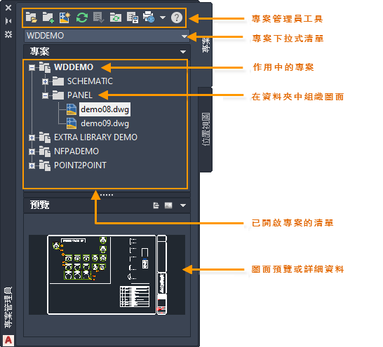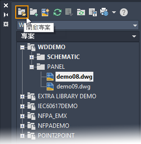 AutoCAD Electrical 工具集 以專案為基礎。專案是一組相關的圖面。所有專案相關資訊 (包括專案中所含圖面) 會儲存在副檔名為 .wdp 的專案檔中。