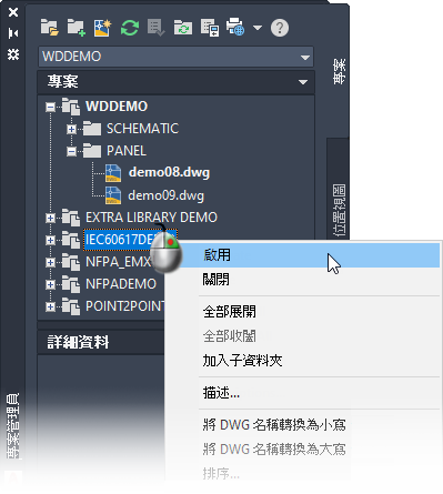 在「專案管理員」中可開啟任意數量的專案,但每次只能有一個專案處於作用中狀態。專案級功能僅處理作用中專案的圖面。