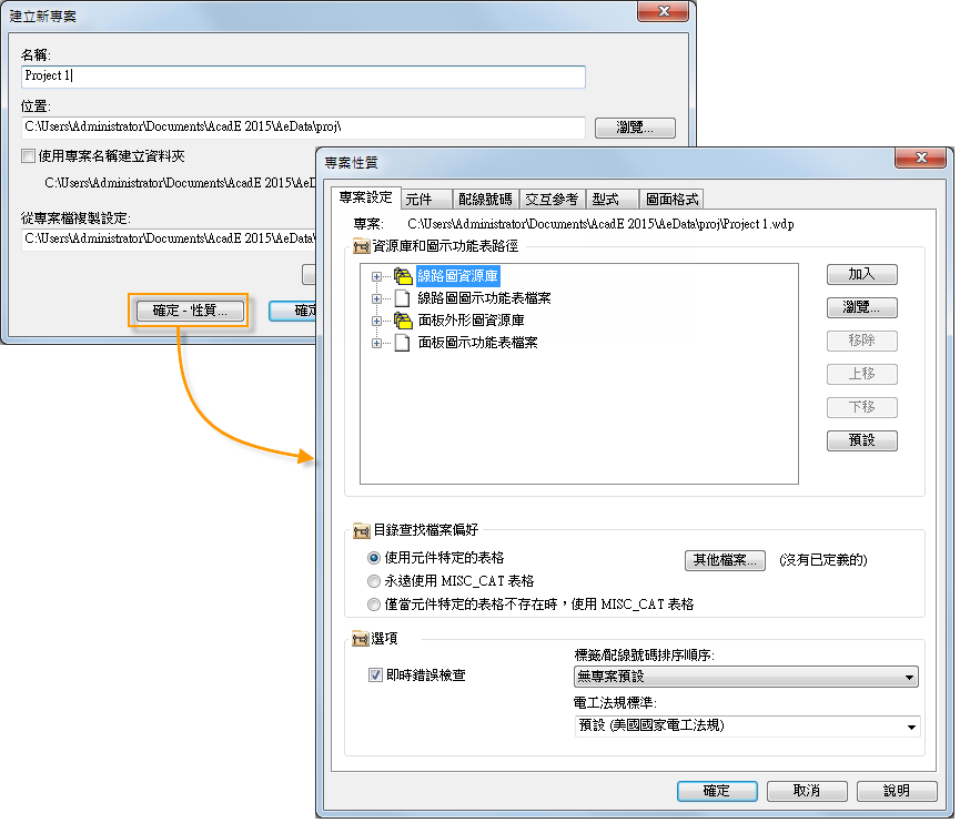 在開始新專案時或在之後任何時間,定義專案性質,例如資源庫路徑、圖面格式和參考型式。