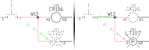 使用帶角度的 T 形接線可以影響接線順序報告。T 形符號的方位將定義排序。每個符號均具有屬性 WDWSEQ,該屬性包含表示優先的配線排序順序的三位數值。90 度轉角或直通區段 (取決於帶角度的 T 形符號的型式) 表示順序的開始。45 度轉角為次級連接。AutoCAD Electrical 工具集 將在每條接線展示時報告接線。