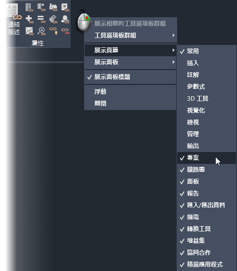 在頁籤區域中按一下右鍵,選取要顯示或隱藏的頁籤。