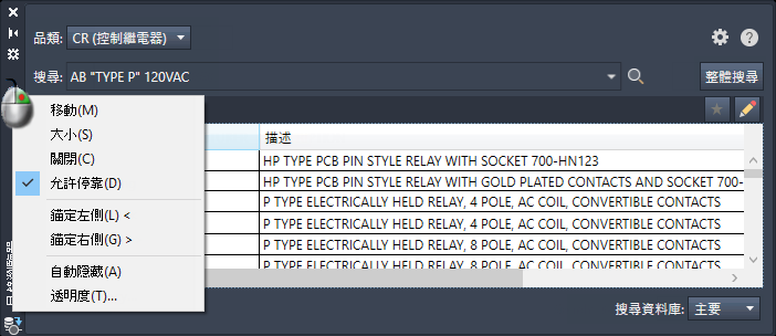 選項板可以停靠、重調大小和設定為自動隱藏,以便您可以控制其使用的螢幕區域大小。如果設定為自動隱藏,將滑鼠置於選項板上時,選項板會自動展開。