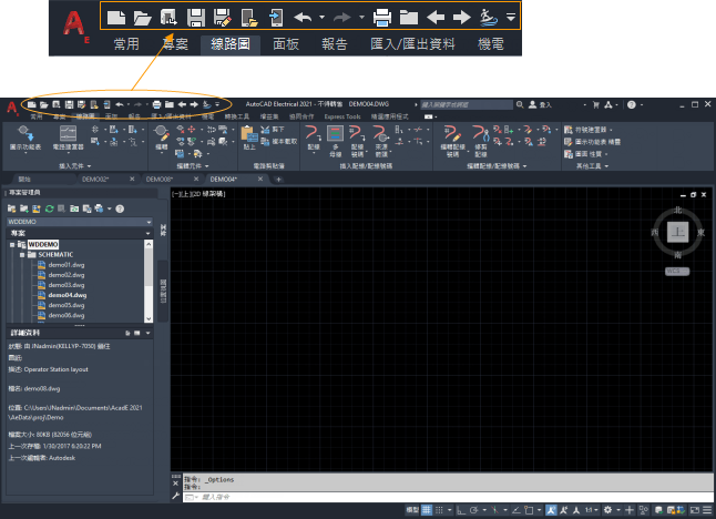 您可以從功能區存取此指南中展示的所有功能。此外,所示的快速存取工具列包括 AutoCAD Electrical 工具集 中使用的一些導覽指令。