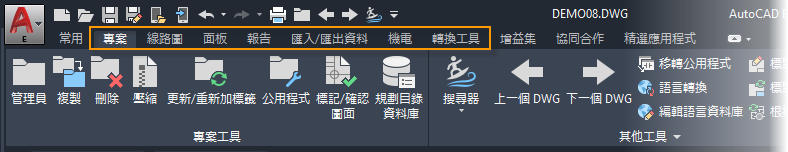 AutoCAD Electrical 工具集 的整個繪圖區頂端包括標準頁籤式功能區。除了 AutoCAD 功能區頁籤,還包括 AutoCAD Electrical 工具集 特定頁籤。