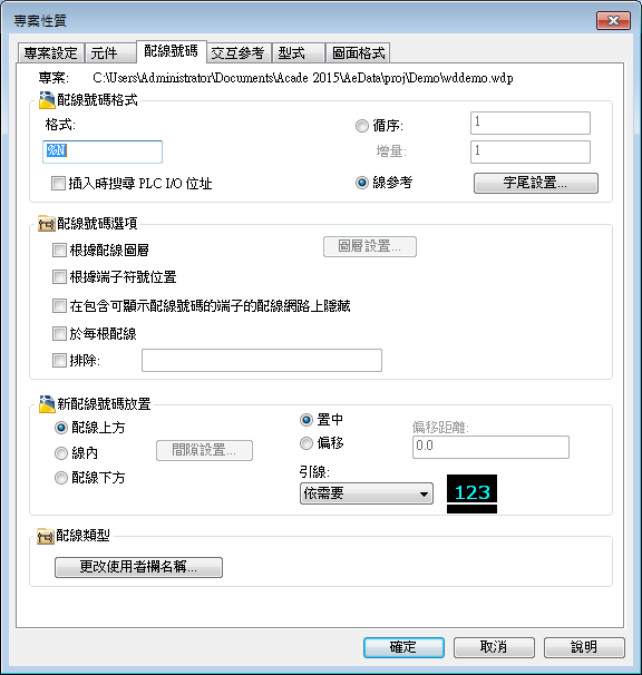您可以使用「專案性質」或「圖面性質」對話方塊,為專案或圖面預設、元件、配線號碼、交互參考、型式和圖面格式指定設定。以下章節中介紹了每個頁籤中可用選項的概述。