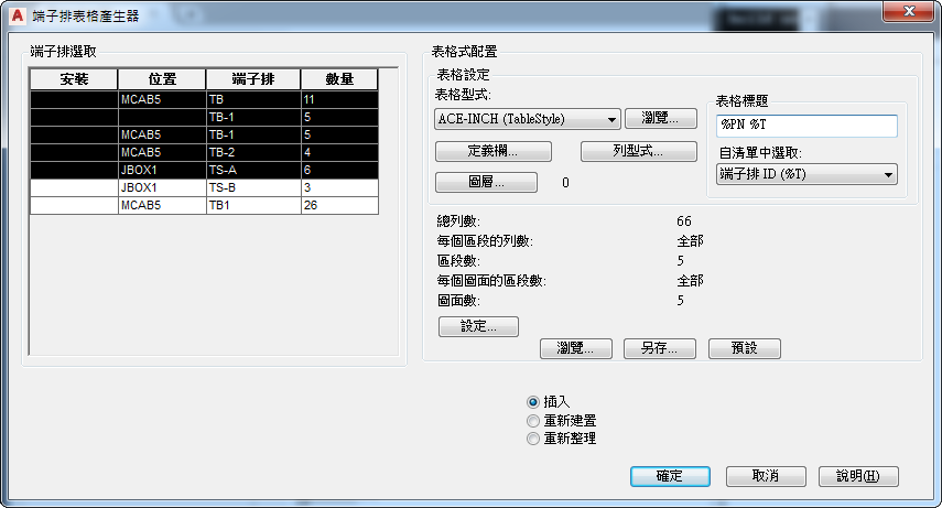 如果您想為一個或多個端子排插入表格式端子排,也可以使用「端子排表格產生器」 查找。
