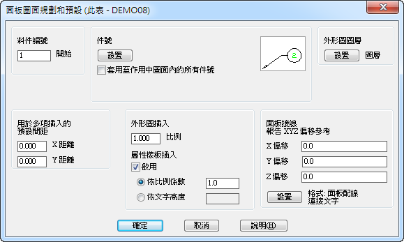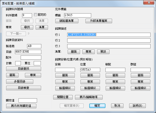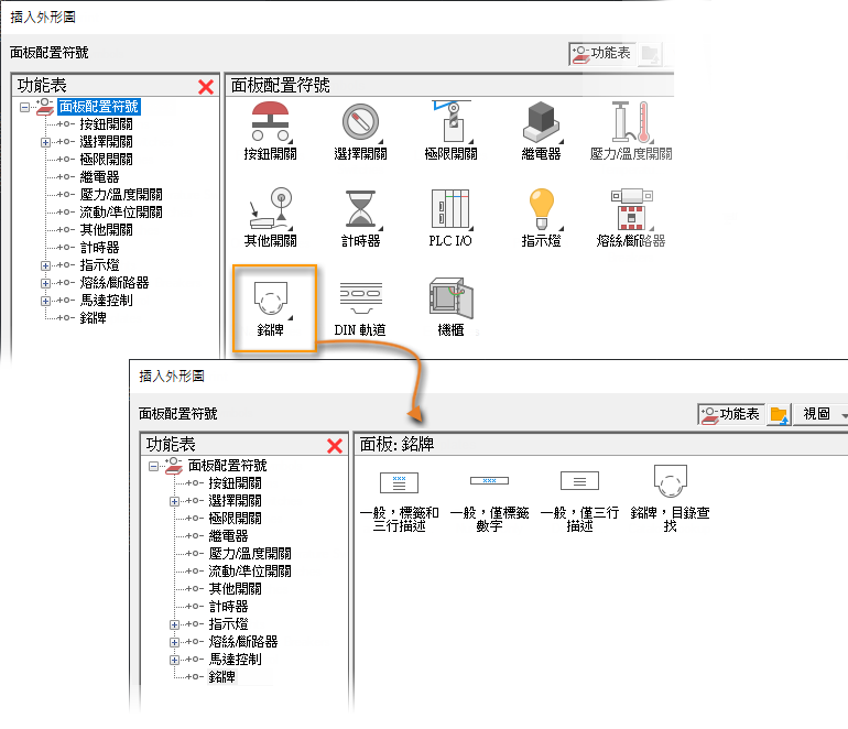 插入銘牌時,您可以將其與面板外形圖相關聯。會從外形圖複製值,例如標籤、安裝、位置和描述。但是,您可以指定特定於銘牌的料件號碼和目錄值。