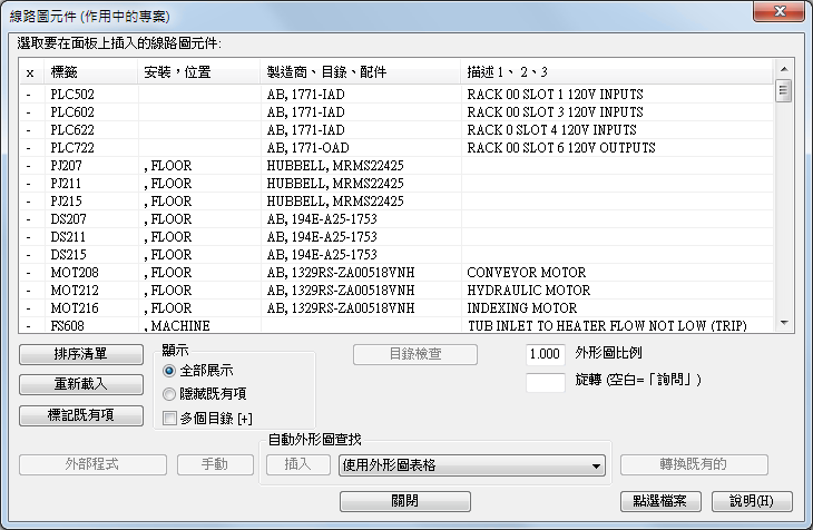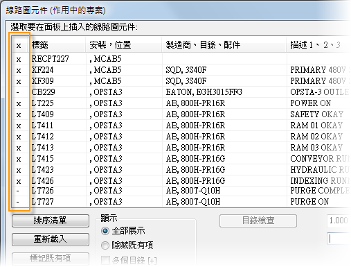 此對話方塊指示哪些線路圖元件已插入到面板配置中。