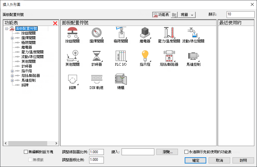 對於未展示在線路圖上的面板元件,請使用面板圖示功能表插入面板外形圖。 查找
