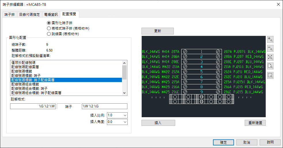 使用「配置預覽」頁籤插入端子排;選取類型與註解型式。使用預覽確保一切都按您所需進行設置。