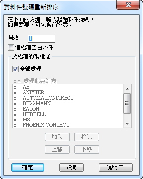 會先處理面板元件,然後再處理線路圖元件。具有相同目錄指定的元件會接收相同的料件號碼。