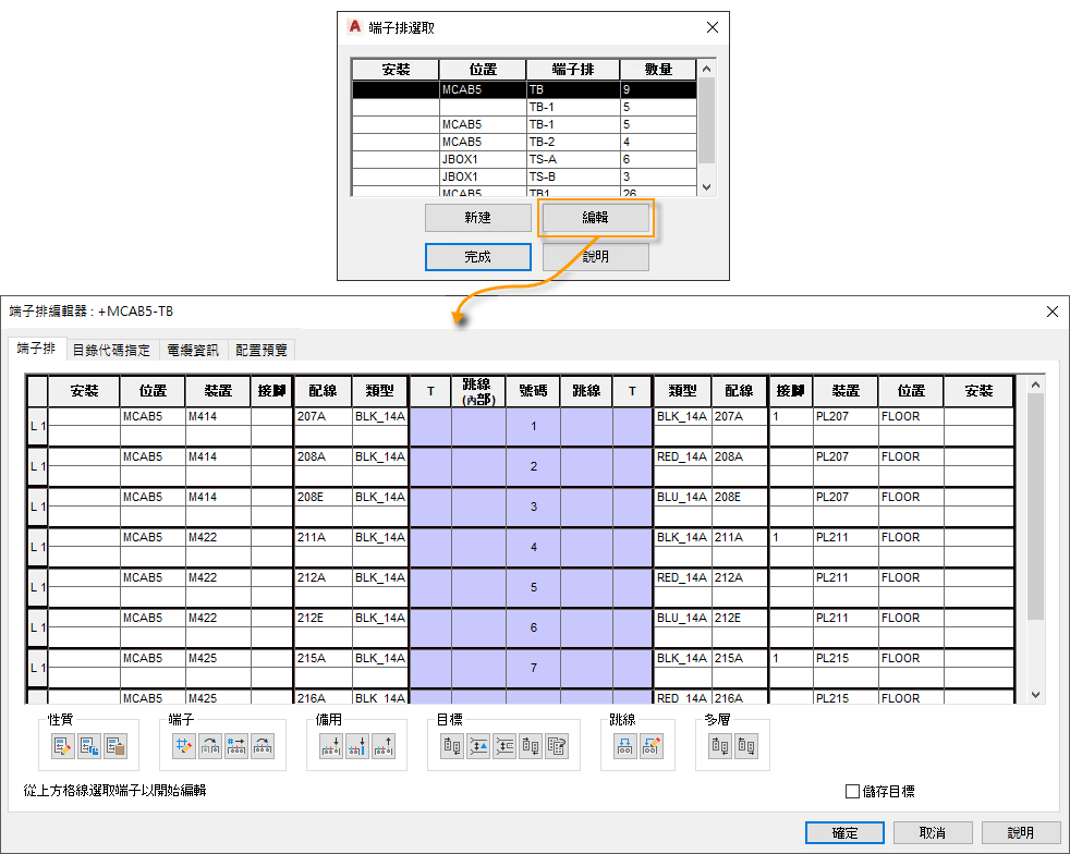 此編輯器包含目錄值、連接元件、連接配線、配線號碼等的相關資訊。